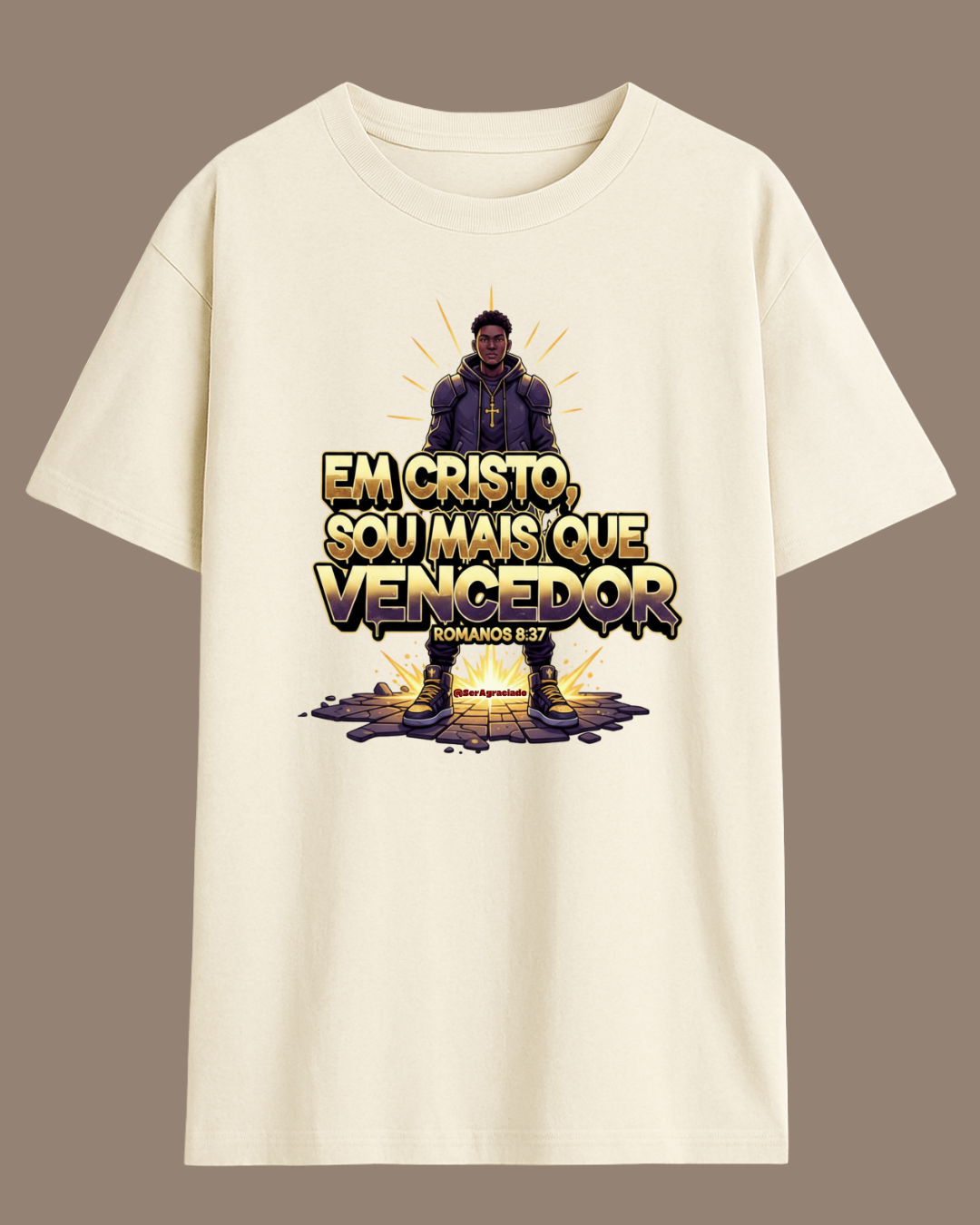 A estampa traz a declaração de Romanos 8:37: “Em Cristo, sou mais que vencedor”. É sobre viver com autoridade espiritual, romper limites e carregar no peito a certeza de que nenhuma batalha é maior que a graça.